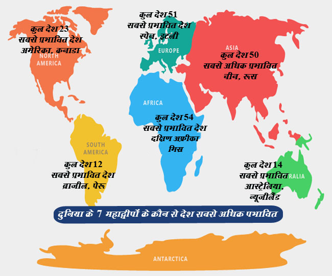आपको बता दें कि दुनिया के सात में से छह महाद्वीपों में से छह में इसका प्रकोप है। इस जानलेवा वायरस से यूरोप में 1469659 संक्रमित हैं तो एशिया में इसके 572638 मरीज हैं। इसके अलावा उत्तरी अमेरिका में इससे पीडि़त 1315748 मरीज हैं तो दक्षिण अमेरिका में 221114 मरीज इससे पीडि़त हैं। अफ्रीका में इससे 47640 लोग संक्रमित हैं और आस्ट्रेलिया महाद्वीप पर 8414 लोग इसकी चपेट में हैं। दुनिया का 7वां महाद्वीप अंटार्कटिका पर इस वायरस का अब तक कोई मामला सामने नहीं आया हे। आपको बता दें कि ये सभी आंकड़े 5 मई 2020 की सुबह 11 बजे तक के हैं जो वर्ल्डओमीटर डॉट इंफो से लिए गए हैं।